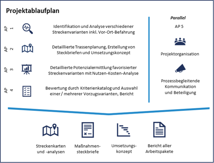 Der Projektprozess der Machbarkeitsstudie gliedert sich in verschiedene Schritte, die bis zum Beginn des kommenden Jahres bearbeitet werden. Zu Beginn werden erste Streckenvarianten identifiziert und diese vor Ort mit dem Fahrrad in Bielefeld befahren.