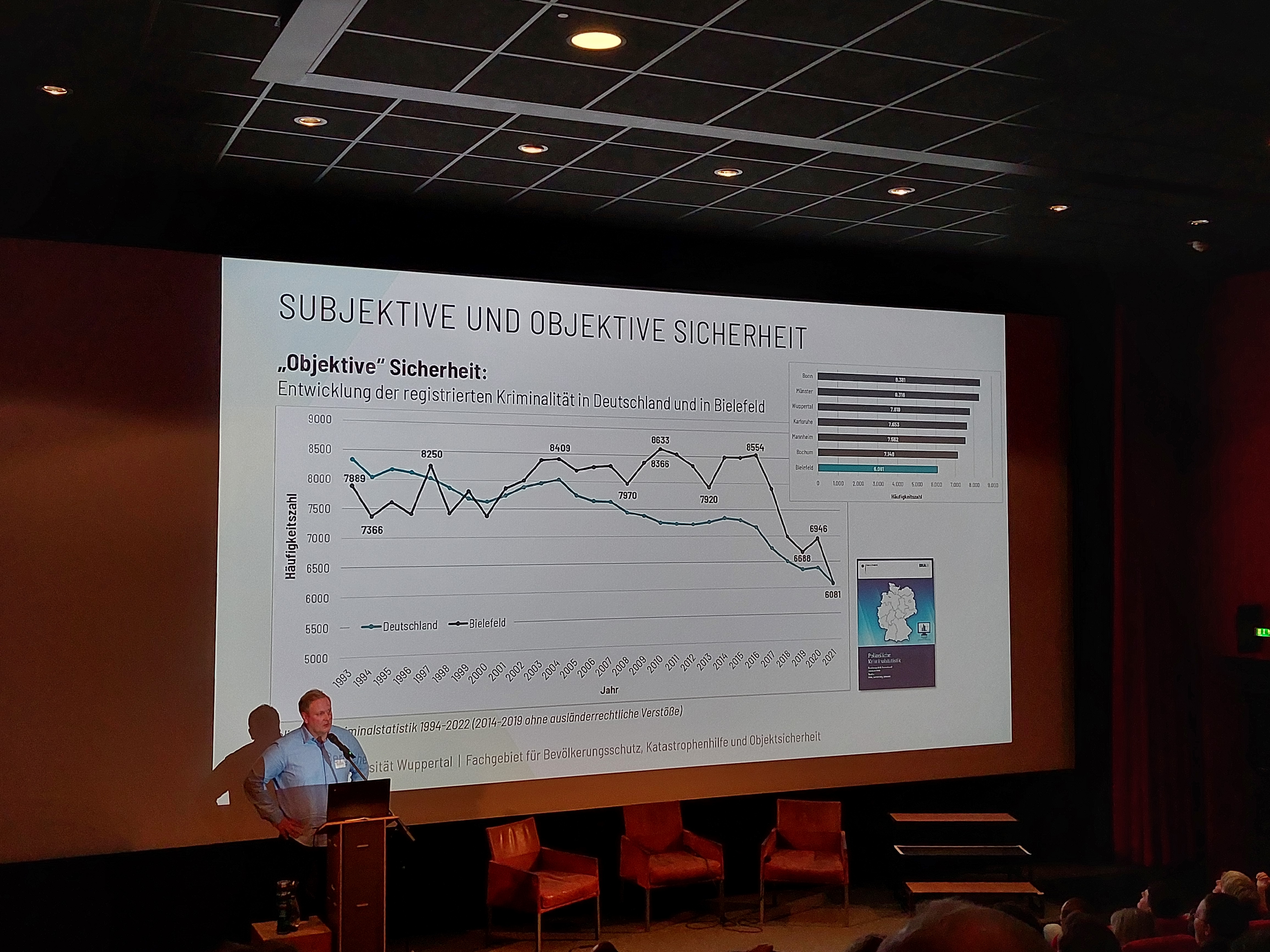 Das Dezernat für Soziales und Integration hat nach der Projektlaufzeit des städtischen Streetwork-Projekts zum Ende des Jahres 2022 zum Impulstag Streetwork in das Lichtwerk im Ravensberger Park eingeladen, um die wichtigsten Erkenntnisse vorzustellen und zu diskutieren. Am Donnerstag, den 27. Oktober 2022, nahmen über 100 Politiker*innen, Vertreter*innen der freien Träger, Studierende und interessierte Bielefelder*innen an der Veranstaltung teil. Bei Popcorn diskutierte das Publikum mit den Expert*innen Themen, wie die öffentliche Wahrnehmung von substanzgebrauchenden Menschen, ihre Stigmatisierung sowie die empfundene Sicherheit im Zusammenhang mit der realen Sicherheit in Bielefeld. Die Folien des Fachvortrags von Dr. Tim Lukas (Universität Wuppertal) Fachvortrags zum Thema „Der Müll, die Stadt und das Verbot – Sicherheit und Sicherheitsgefühle in urbanen Räumen“ finden Sie hier.