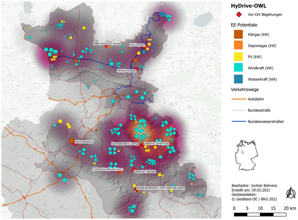 Mit dem Projekt HyDrive OWL wurde zudem vom Fraunhofer Institut für Solare Energiesysteme ISE ein Feinkonzept für den Aufbau einer regionalen Wasserstoff-Infrastruktur entwickelt. Gemeinsam mit der Stadt Bielefeld und allen Kreisen in OWL wurden die Potenziale für eine Erzeugung von Wasserstoff an neun ausgewählten Standorten und die Nutzungspotenziale in den Sektoren Verkehr und Industrie untersucht. Zudem wurden technische Konzepte für die Errichtung erster Erzeugungsanlagen inkl. zugehöriger Wasserstofflogistik entwickelt und mögliche Standorte für die Errichtung von Wasserstofftankstellen identifiziert. In der Feinkonzeptionierung wurden alle Glieder der Wasserstoffwertschöpfungskette miteinander verknüpft und dabei in einer geo-techno-ökonomischen Analyse finale Standorte festgelegt. Weiterhin wurden übergreifende Betriebskonzepte sowie eine Umsetzungsroadmap entwickelt. Gemeinsam mit den Akteur*innen aus dem – während des Projekts etablierten – Netzwerks wird weiter an der Konkretisierung einer Wasserstoff-Infrastruktur und deren Nutzung in OWL gearbeitet.