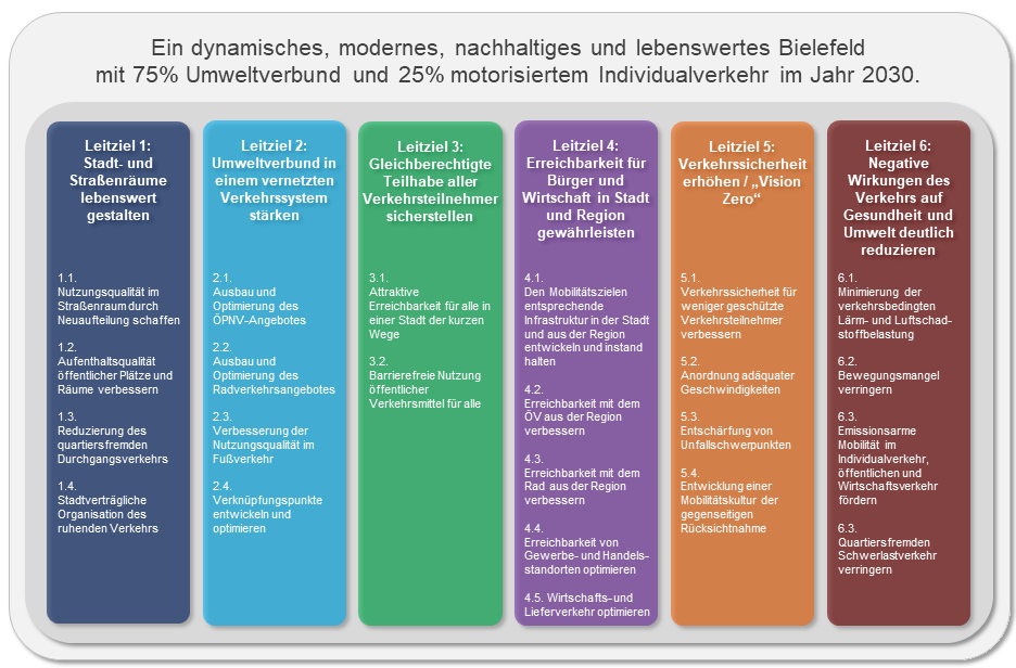Die übergeordnete Vision ist ein dynamisches, modernes, nachhaltiges und lebenswertes Bielefeld mit den Änderungen im Gesamtverkehrsaufkommen. Damit einher gehen folgende sechs Leitziele: