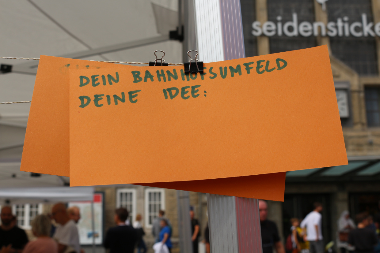 Bereits Anfang September startete die Beteiligung zur Machbarkeitsstudie Bahnhofsumfeld Bielefeld mit dem Ideenmarktplatz auf dem Bahnhofsvorplatz. In vielen Gesprächen und Gruppendiskussionen wurden dem Planungsteam und den Vertreterinnen und Vertretern der Verwaltung Themen, Ideen und Anregungen mit auf den Weg gegeben.