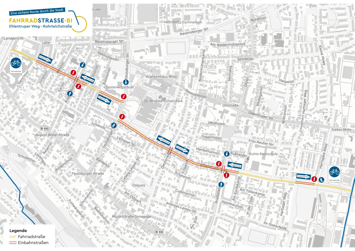 Die Verbindung Ehlentruper Weg und Rohrteichstraße ist eine Hauptroute für den Radverkehr, die aus den östlichen Stadtbezirken direkt in die Altstadt führt. Nachdem die politischen Gremien – die Bezirksvertretung Mitte und der Stadtentwicklungsausschuss – die Einrichtung und Gestaltung einer Fahrradstraße dort beschlossen haben, geht es nun in die konkrete Umsetzung. Die erste Testphase für die Verkehrsführung, die zur Reduzierung des Durchgangsverkehrs führen soll, startet am Mittwoch, 26. Oktober. Dabei werden die komplette Rohrteichstraße und der Ehlentruper Weg zwischen Teutoburger Straße und Otto-Brenner-Straße zur Fahrradstraße.