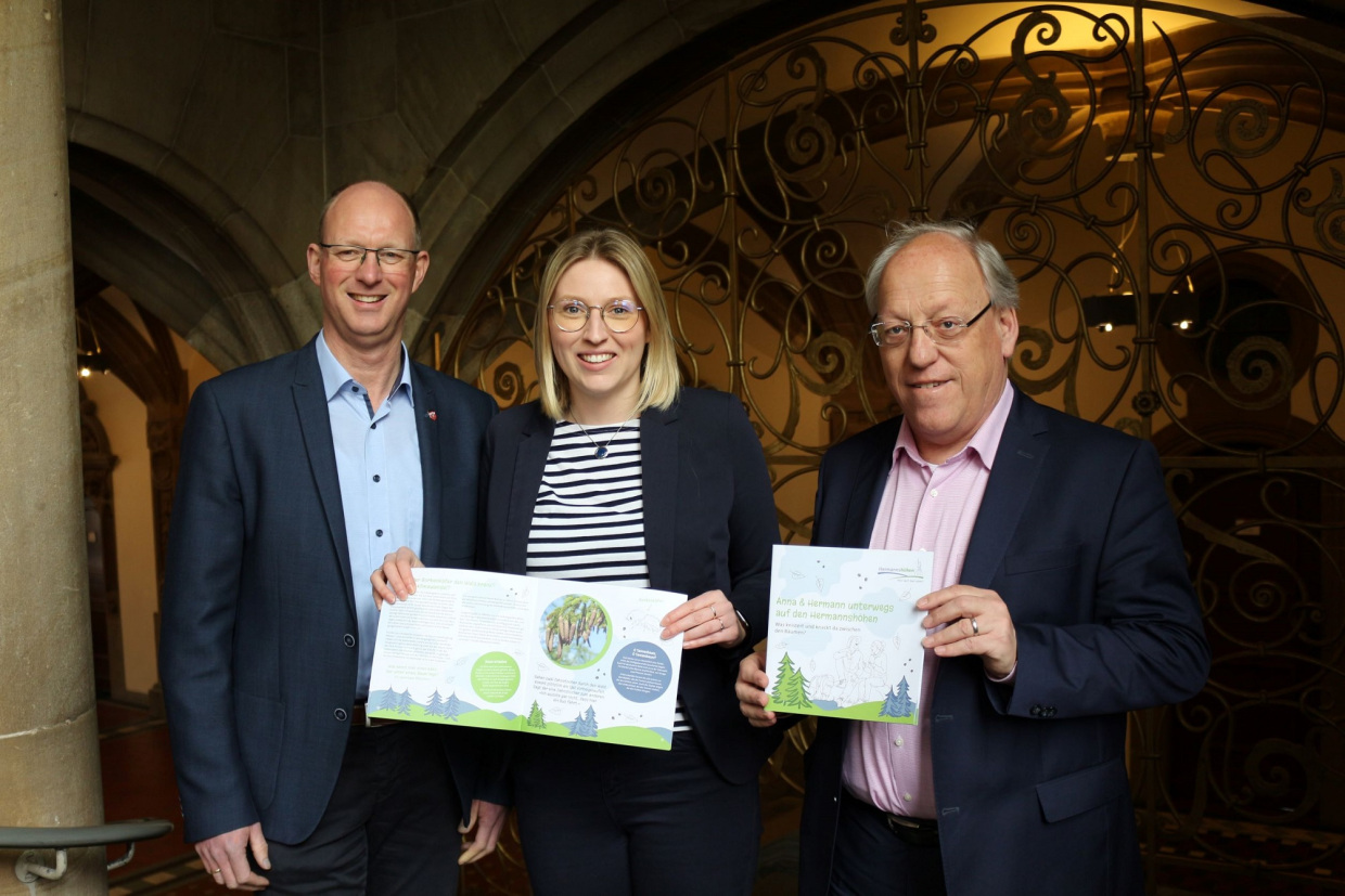 Kurz vor den Osterferien machen die Kommunen Bielefeld, Halle (Westf.), Werther (Westf.), Steinhagen und Oerlinghausen ihren etwa 9.000 Grundschülerinnen und Grundschülern der zweiten und dritten Klassen ein frühes Ostergeschenk und verschenken das Lernheft „Anna und Hermann unterwegs auf den Hermannshöhen“. Das Heft nimmt die Kinder mit auf eine Wanderung durch den Teutoburger Wald. Dabei begegnen ihnen verschiedene Geschichten, die sie spielerisch für Themen rund um die Natur und die Umwelt sensibilisieren. Die fünf Orte aus dem Heft können zudem bei einem Ausflug in die Region erkundet werden.