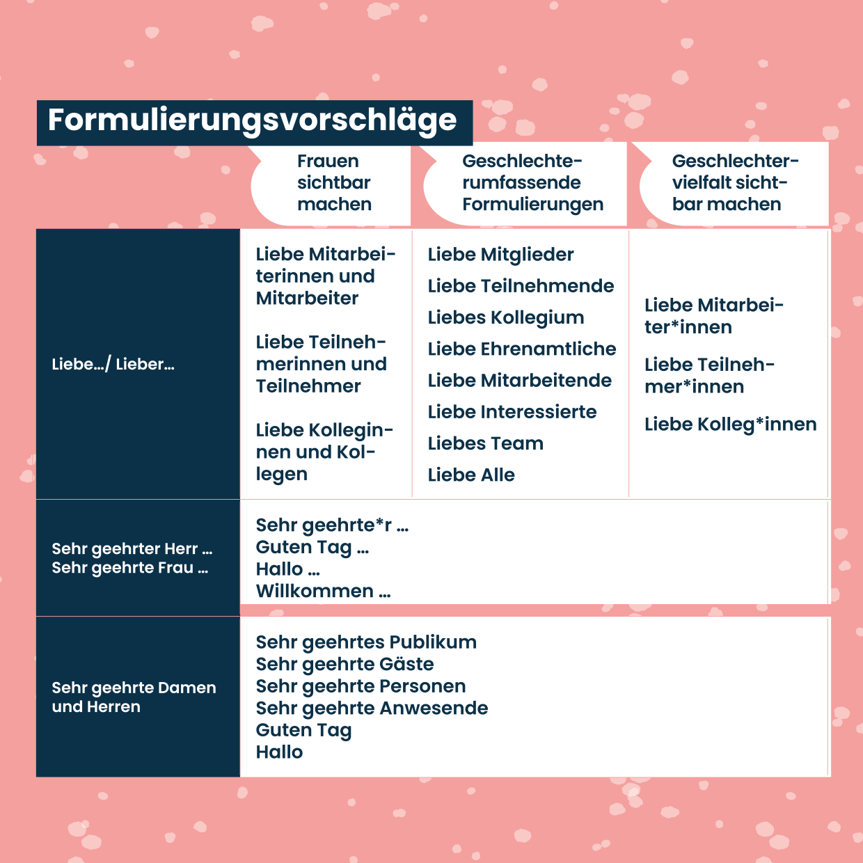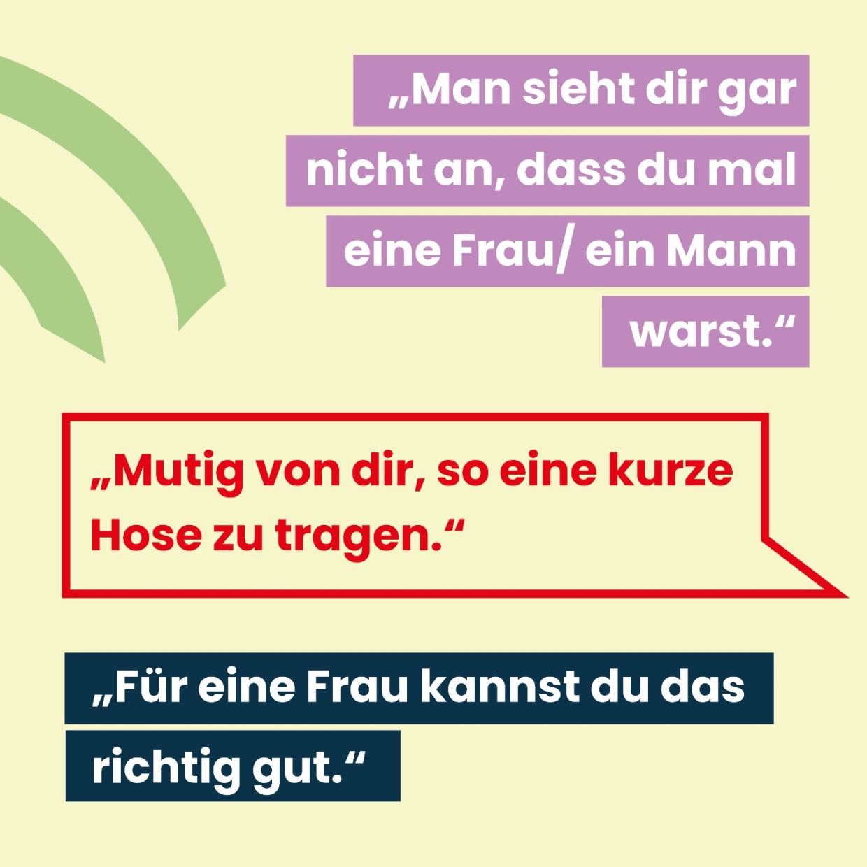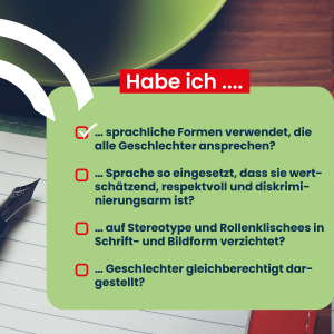 Social Media Posts Geschlechtergerechte Sprache Checkliste geschlechtergerechte Sprache Geschlechtergerechte Sprache bei Anträgen und Formularen Leitfaden Anschreiben geschlechtergerechte Sprache Geschlechtergerechte Formulierungen bei Ausschreibungen Komplimente, die keine sind - Alter Komplimente, die keine sind - Geschlecht Komplimente, die keine sind - Sexuelle Identität Komplimente, die keine sind - Kultur und Ethnie Komplimente, die keine sind - Behinderung Wertschätzende Kommunikation - Vielfalt Wertschätzende Kommunikation - Alter Wertschätzende Kommunikation - Geschlecht Wertschätzende Kommunikation - Sexuelle Identität Wertschätzende Kommunikation - ethnische Herkunft und Kultur Wertschätzende Kommunikation - Behinderung Sprache erzeugt Bilder