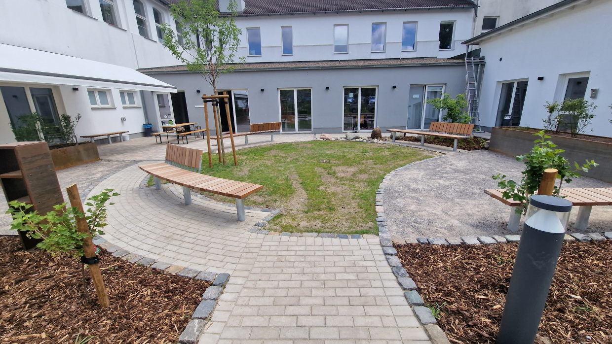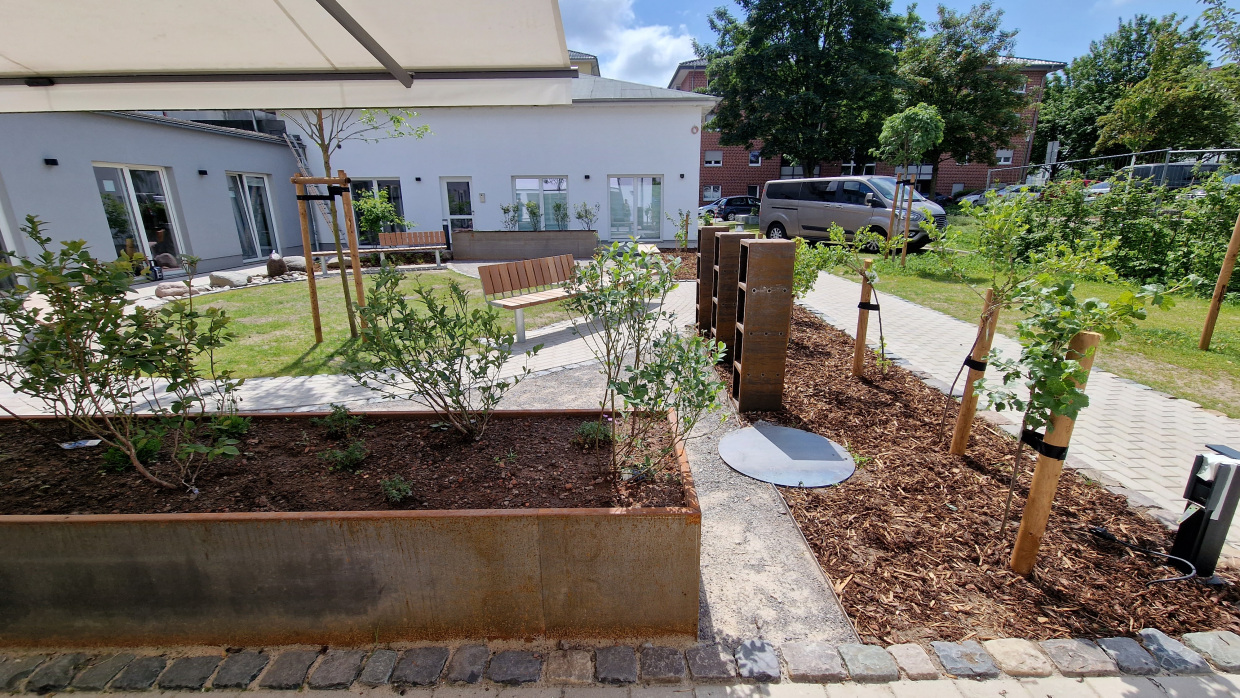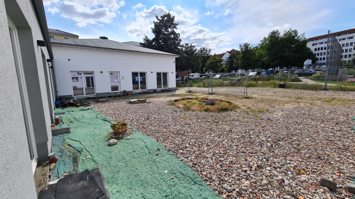 Durch die Entsiegelung der Flächen entsteht eine großzügige Rasenfläche, sowie eine daran angrenzende wassergebundene Fläche. Diese sollen zum Aufenthalt einladen und bieten genügend Platz für künftige Veranstaltungen an. Naturnahe Lernspielorte fördern die Bildung von Kindern im Rahmen der Naturpädagogik. Der Garten soll Kindern und auch Erwachsenen den Ablauf der Jahreszeiten zeigen. Dazu wurde eine Wasserstelle und ein Bienen- und Schmetterlingsbeet angelegt, das mit seinen verschiedenen Pflanzungen im Sommer Insekten Nahrung bietet und im Winter einen Rückzugsort. Die Hochbeete dienen der Bepflanzung durch die Anwohner*innen. Das angebaute Obst und Gemüse kann in der Küche des Umweltzentrums gemeinsam zubereitet werden.