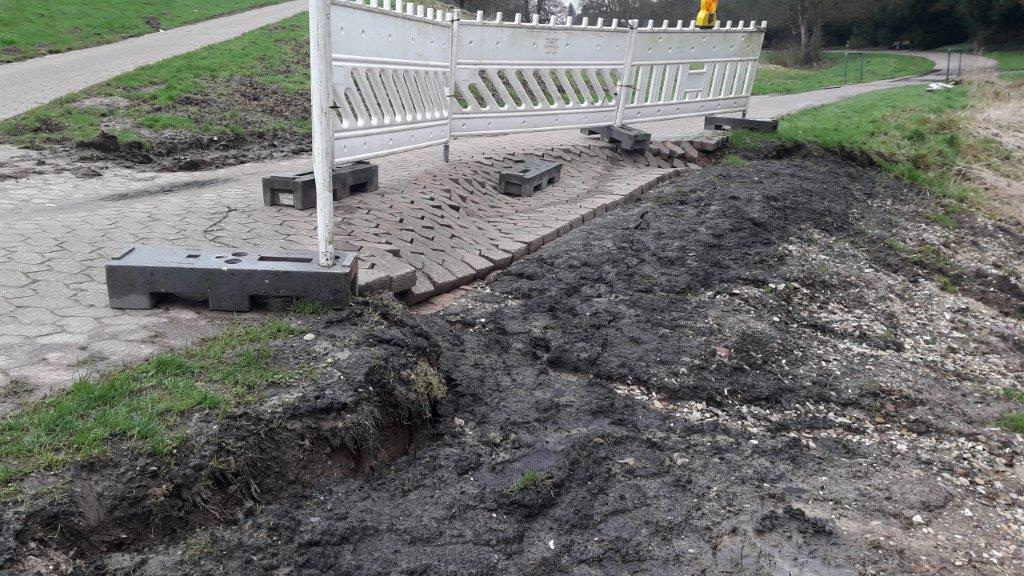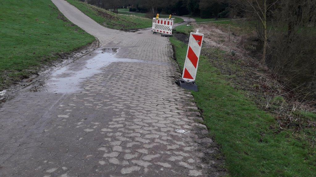 Der abgerutschte Pflasterweg kann aber erst instandgesetzt werden, wenn der wassergesättigte Boden abgetrocknet ist. „Vorher ist es leider unmöglich, die Bauarbeiten zu beginnen“, sagt Stefan Meyer, Abschnittsleiter Grünunterhaltung im Umweltbetrieb. „Der von uns eingesetzte Gutachter bewertet den Weg und die Böschung sogar als so instabil, dass er weitere Verformungen und Rutschungen derzeit nicht ausschließen kann.“ Auch auf Grund dieser Empfehlung hat der Umweltbetrieb beschlossen, diesen Bereich gänzlich abzusperren. Wie lange diese Sperrung andauert, ist derzeit noch nicht abzusehen. Dazu Stefan Meyer: „Jetzt warten wir darauf, dass der Bereich abtrocknet. Deshalb kann sich die Sperrung noch einige Wochen hinziehen.“