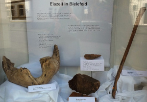 Ein Mammut im Bielefelder Westen: Zu sehen sind ein Unterkiefer, ein Mahlzahn, eine Rippe sowie ein Faustkeil. Foto: Marion Scheuer.