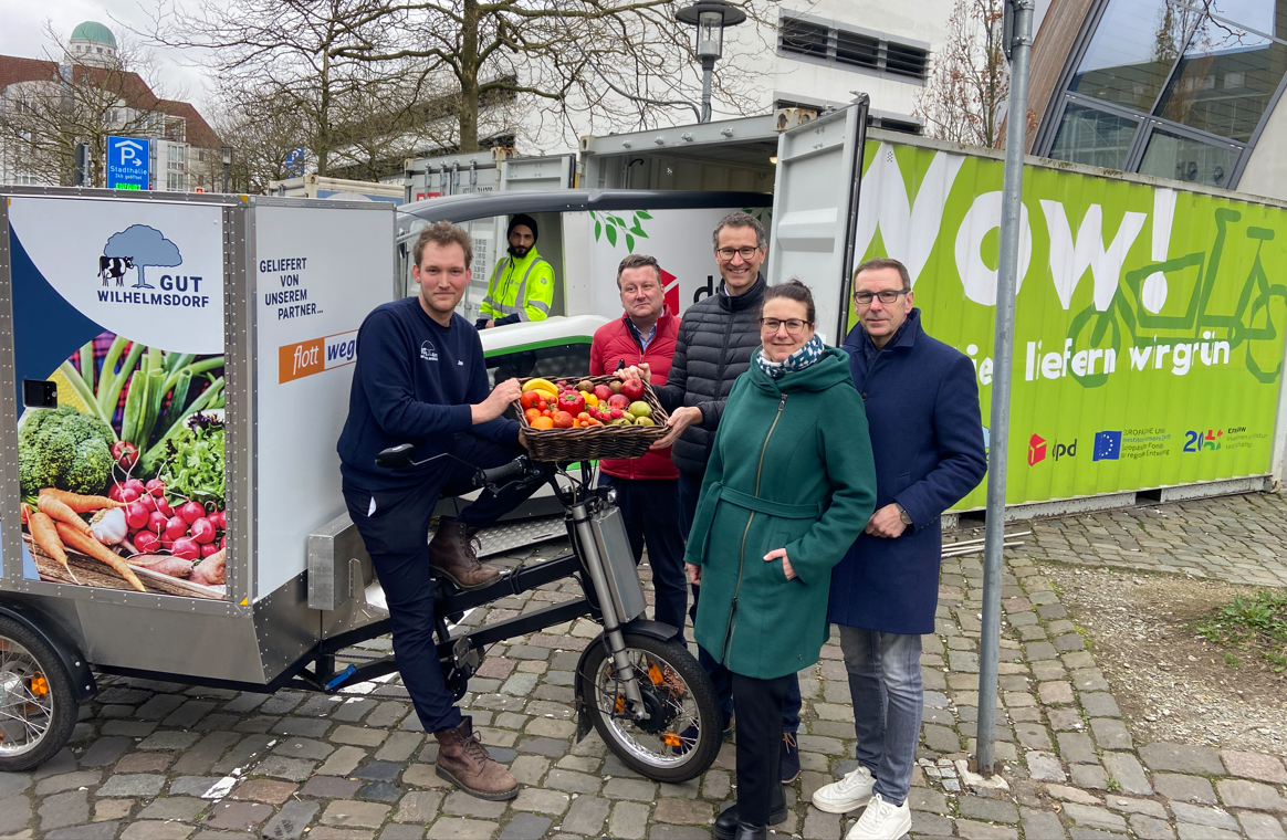 Jan Hoyer, Geschäftsführung Gut Wilhelmsdorf, erklärt: „Wir beliefern etwa 400 Kunden pro Monat mit dem Lastenrad – pro Woche sind das bis zu 500 Kilo Obst und Gemüse, zehn Kilo Käse, 50 Brote und 180 Kilo unserer hofeigenen Milch und Joghurt – alles in Bio-Qualität. Wir fahren durch die Nutzung der Lastenräder je Monat etwa 800 Kilometer weniger mit unserem Lieferwagen. Den größten Vorteil sehen wir in dem verringerten Stress für unsere Fahrer, in den engen Innenstadtstraßen mit wenig Parkplätzen sind Lastenräder einfach besser geeignet.“