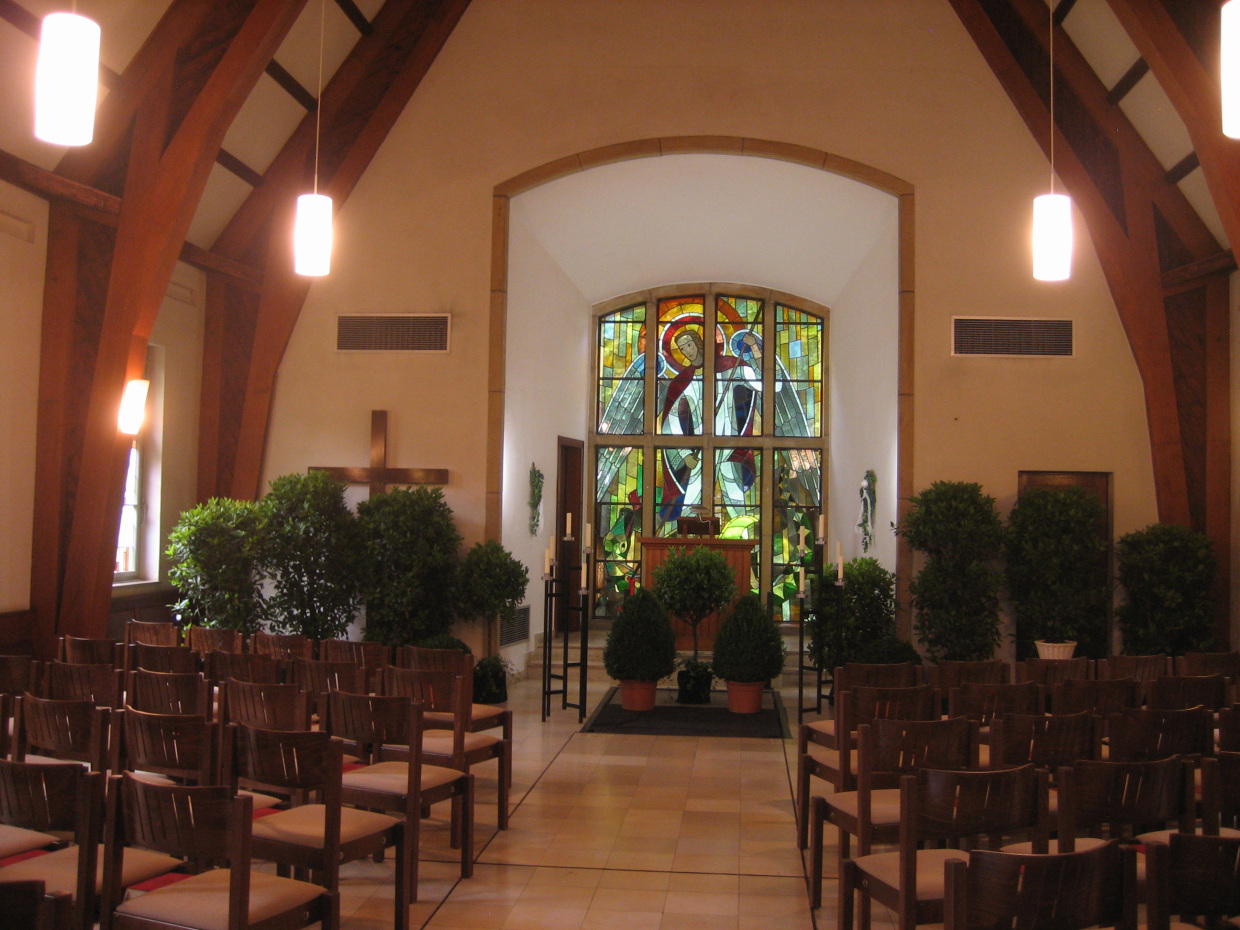Die von Paul Gerhardt, von den Werkstätten für angewandte Kunst in Werther, geschaffenen Glasfenster lassen freundliches Licht ins Innere. Hinterbliebenen steht ein ansprechender und moderner Raum für Ihre Trauerfeier zur Verfügung. Die Kapelle bietet Raum für rund 80 Personen.