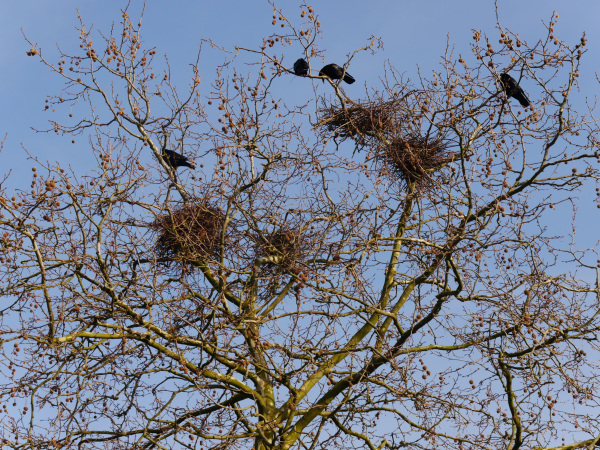 Noch immer ist die Saatkrähe ein seltener Vogel und der Mensch trägt die Verantwortung für den Erhalt dieser Art. Nun sind nicht alle Bürger*innen vom lauten Krächzen der gesellig brütenden Stadtbewohner begeistert oder sie fühlen sich durch den Kot unter den Bäumen gestört. Die Forderung eine Kolonie im Siedlungsbereich aufzulösen, steht schnell im Raum. Es zeigt aber die Erfahrung, dass mit einer Auflösung das "Problem" nicht gelöst, sondern nur verlagert wird: Saatkrähenkolonien siedeln bei Störungen in andere Teile des Stadtgebietes um und teilen sich dabei auf, wodurch andere und auch deutlich mehr Bürger "betroffen" sein können. Eine Vertreibung einer Kolonie kann also nur in einem fachlich sehr gut begründeten Einzelfall eine Möglichkeit sein und muss von der unteren Naturschutzbehörde im Umweltamt genehmigt werden.