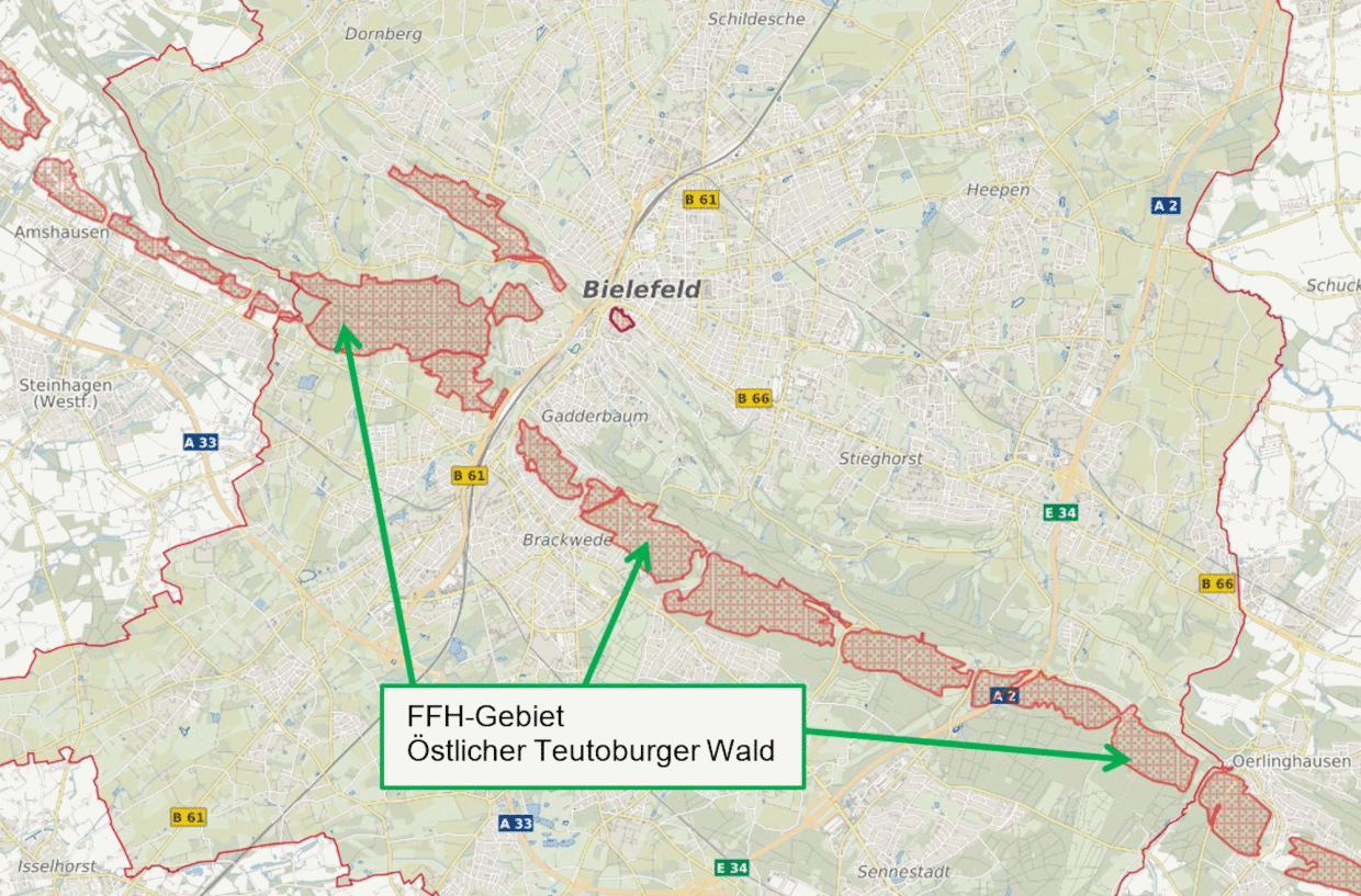 Zum geschützten FFH-Gebiet mit dem Namen „Östlicher Teutoburger Wald“ gehört vor allem der südlich verlaufende Pläner-Kalkzug des Teutoburger Waldes zwischen Borgholzhausen und Horn-Bad Meinberg. Charakteristisch sind seine ausgedehnten Kalk- und Hainsimsen-Buchenwälder. Sie stellen in ihrer Ausdehnung das größte und wichtigste Waldgebiet des Naturraumes Weserbergland dar. In Bielefeld besitzt das Naturschutzgebiet eine Größe von ca. 1.009 ha.
