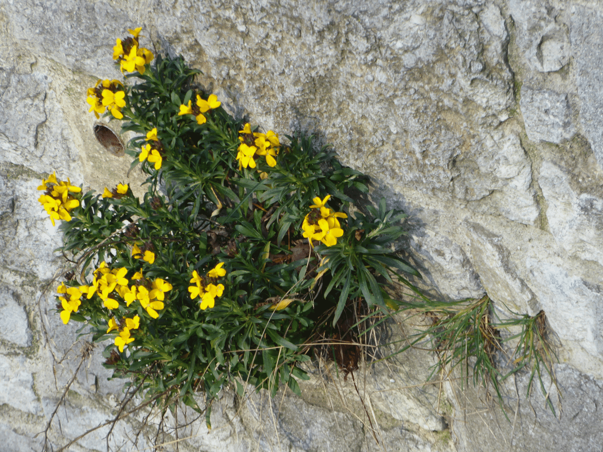 Auch die Außenmauern haben für Tiere und Pflanzen etwas zu bieten. Der Goldlack ist ein außerordentlich bemerkenswertes Kulturrelikt, das bereits im 18. Jahrhundert an der Sparrenburg heimisch wurde. Ursprünglich aus dem Mittelmeerraum erfreut der zierliche Halbstrauch im Mai mit seinen leuchtend gelben Blüten. In kleinen Fugen finden die Wurzeln des genügsamen Gewächses Halt, Nähstoffe und Wasser. Aber es braucht einen Platz in der Sonne. Vor der letzten Sanierung der Mauern wurde von verschiedenen Stellen Saatgut entnommen und im Botanischen Garten der Stadt isoliert zu kleinen Pflänzchen herangezogen und an geeigneter Stelle wieder ausgepflanzt. Inzwischen hat sich der Goldlack an der Sparrenburg gut etabliert. Wie die Farne und zierlichen Blütenpflanzen richtet er keinen Schaden am Mauerwerk an.