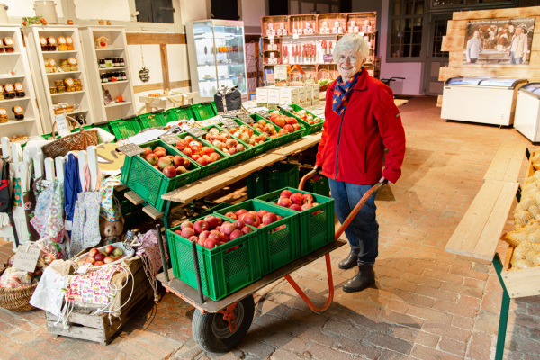 Äpfel aus eigenem Anbau sowie Apfelsaft, Frischmilch "Dorfmilch", Wurstsortiment von eigenen Schweinen, Rindfleisch von Tieren aus der Nachbarschaft, regional erzeugte Eier, Kartoffeln, Honig und diverse eingeweckte Produkte,