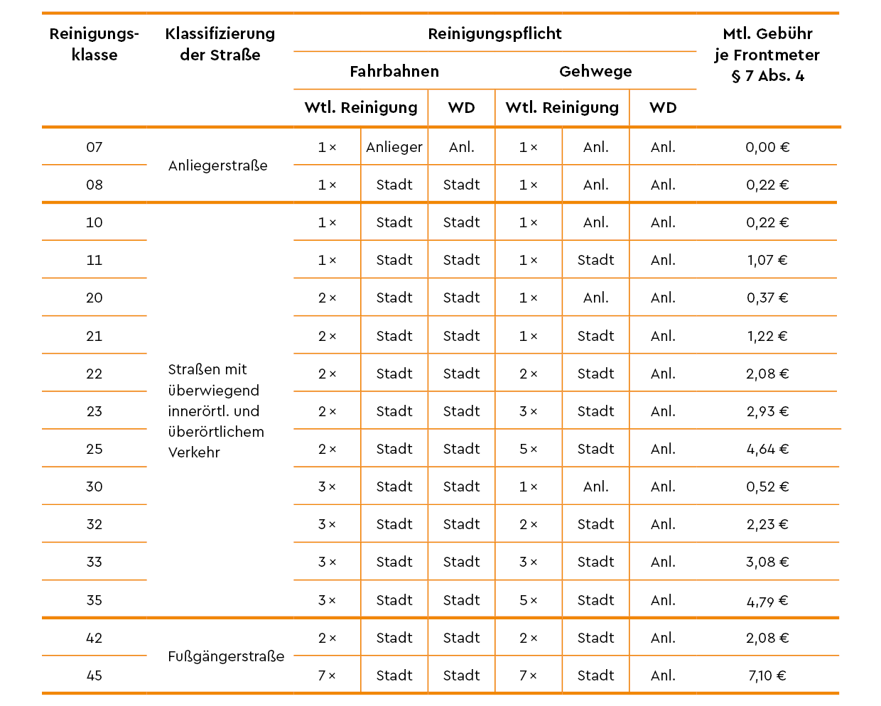 Wenn Sie in einer Straße wohnen, die der Reinigungsklasse 07 zugeordnet wird, fallen für Sie keinerlei Gebühren an, da Sie sowohl für die Reinigung der Straße als auch der Gehwege selbst verantwortlich sind. Das gleiche gilt für die Winterdienstpflicht.