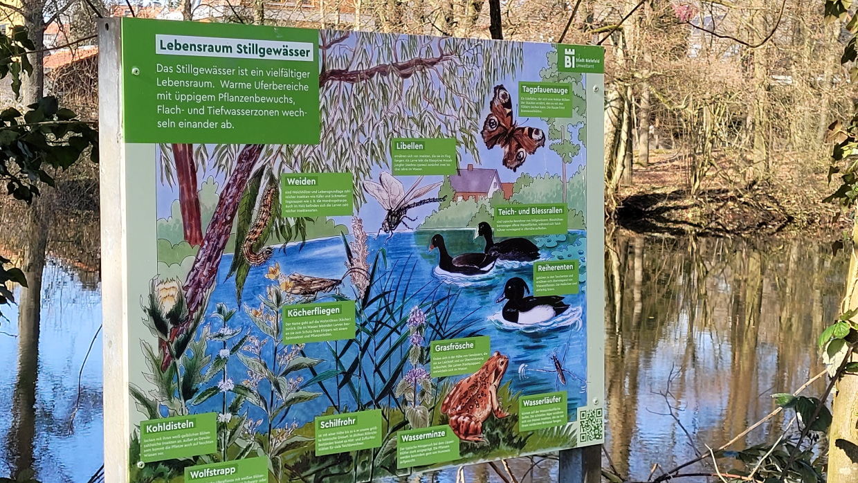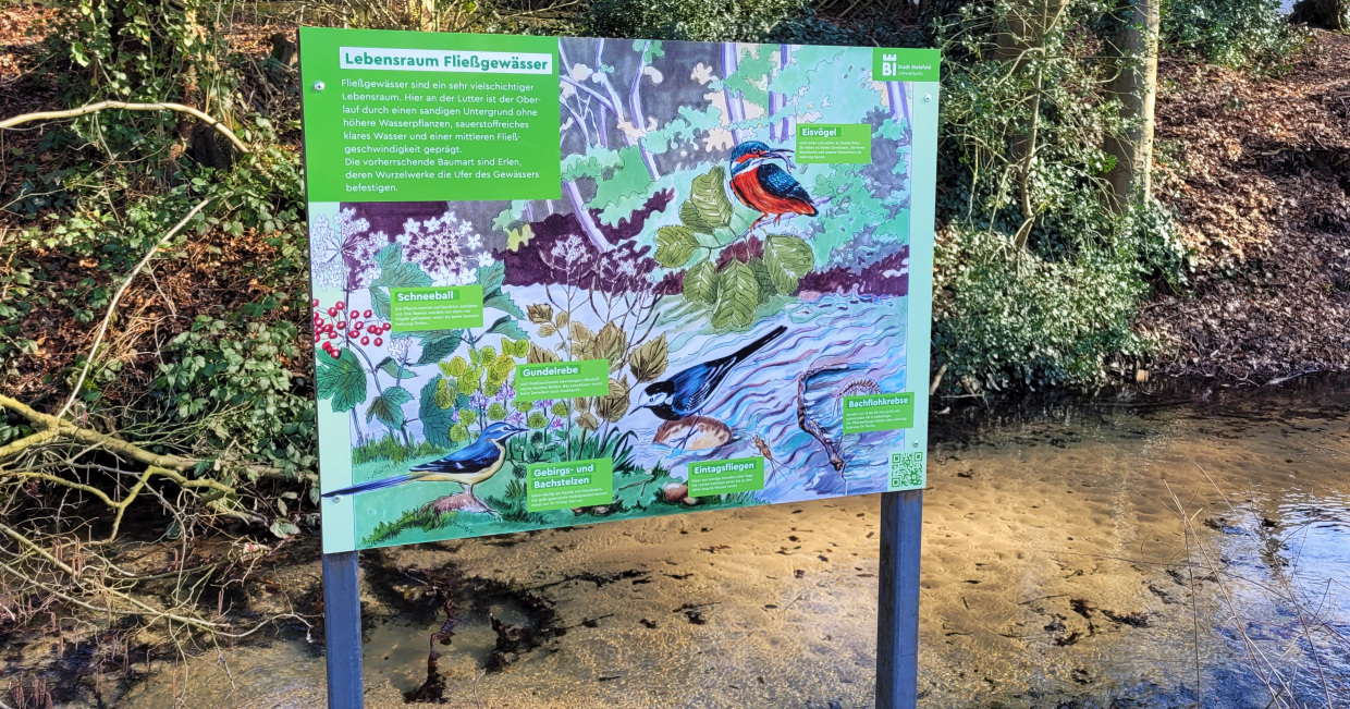 Auf knapp 600 Metern Länge erhalten die Besucher*innen mit insgesamt sechs Lehrpfadtafeln Informationen zur Geschichte und zu einzelnen Lebensräumen dieses Bielefelder Talabschnittes, die anschaulich illustriert sind. Hier handelt es sich um einen der ersten Naturlehrpfade dieser Art in Deutschland. In einem umfangreichen Relaunch wurden die Tafeln im Jahr 2021 vollständig erneuert und mit Kamerabefliegungen sowie weiterführenden Internetangeboten angereichert. Alle Informationen lassen sich über QR-Codes vor Ort abrufen oder hier auf der Bielefelder Internetseite in Vorfeld eines Besuches betrachten.